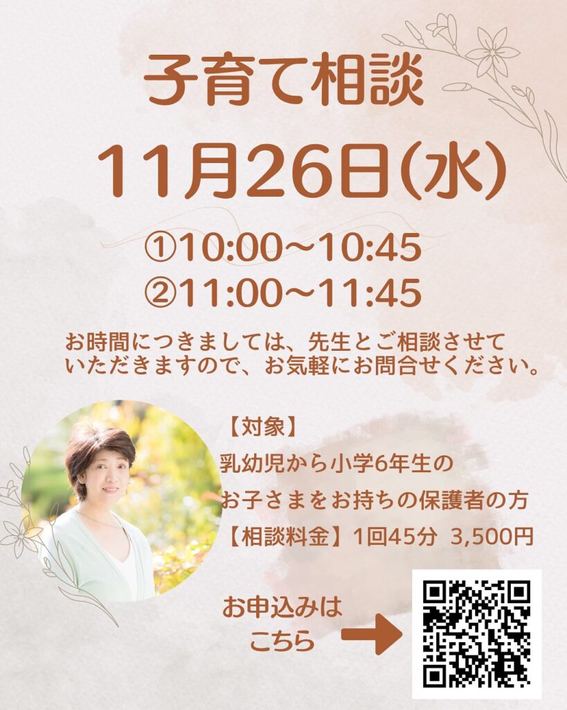 他に子育て力アップ講座や子育て電話相談、カウンセリング、アドバイスを長年にわたり続けてこられた豊富な経験と専門知識をお持ちの信頼できる先生です。